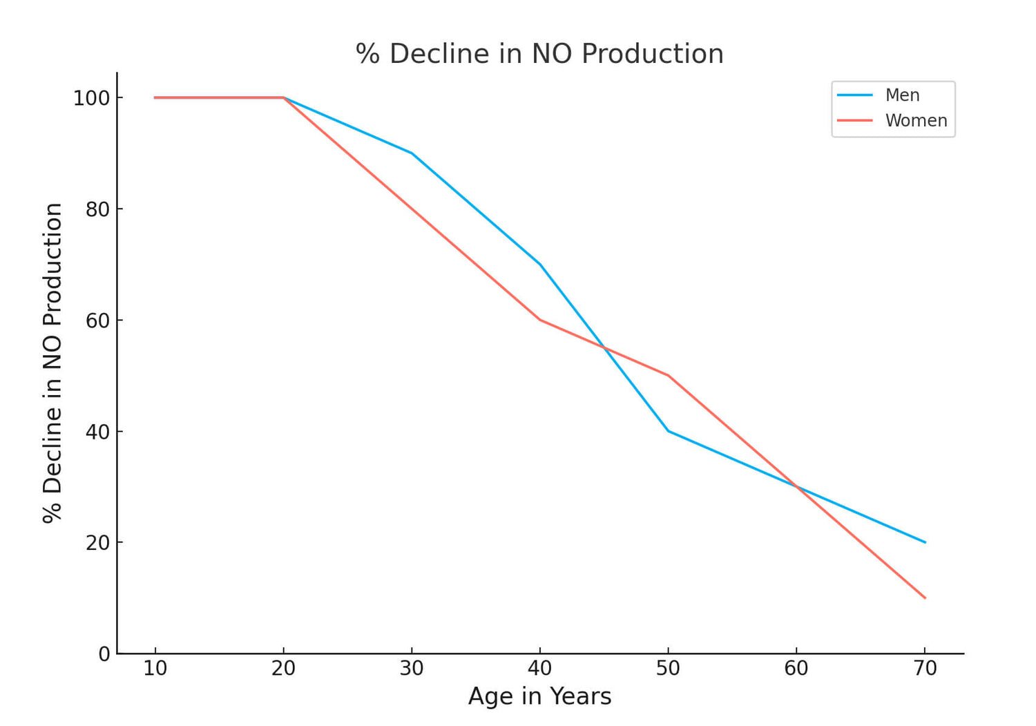 We make less and less Nitric Oxide as we get older, so it is important to continuously support Nitric Oxide every day through diet or supplementation.